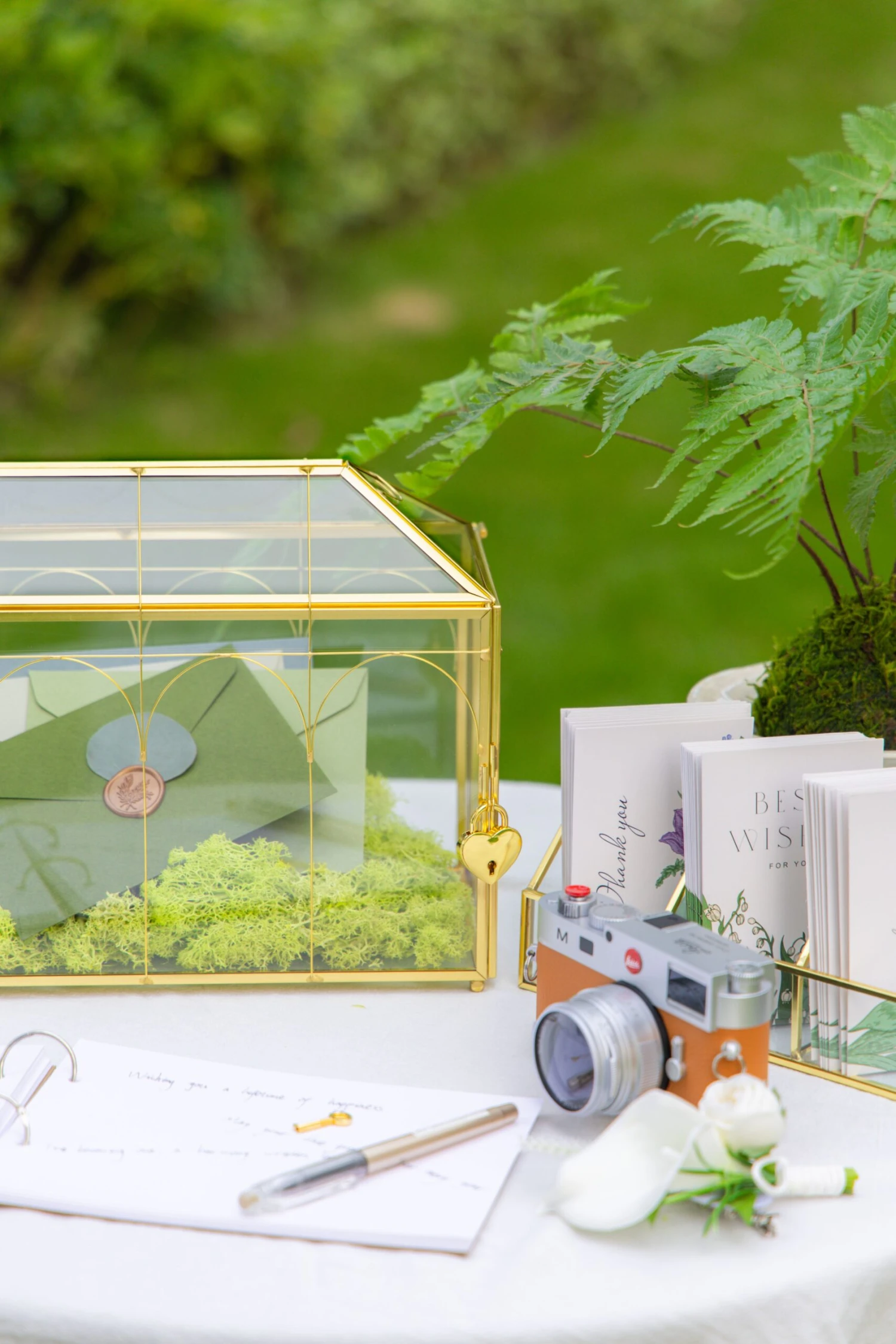 1. Â It is designed and handmade by our team, crafted with brass and reinforced glass. The glass is sturdy and clear. This gold card box features decorative wires, a large slot to put cards in, and a heart-shaped lock to ensure safety.