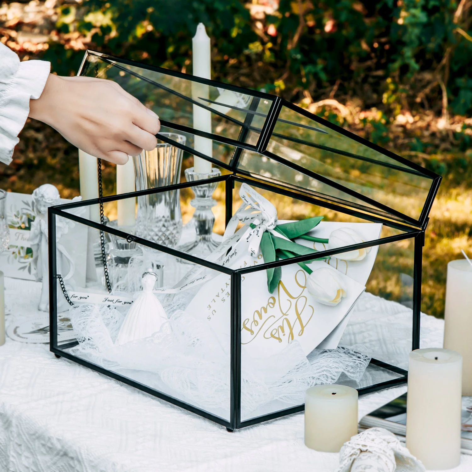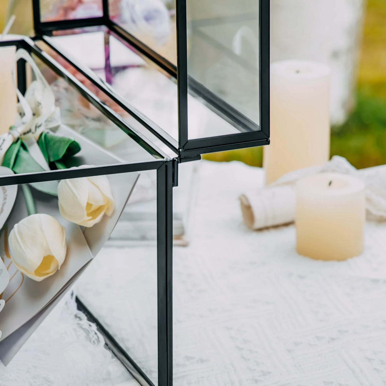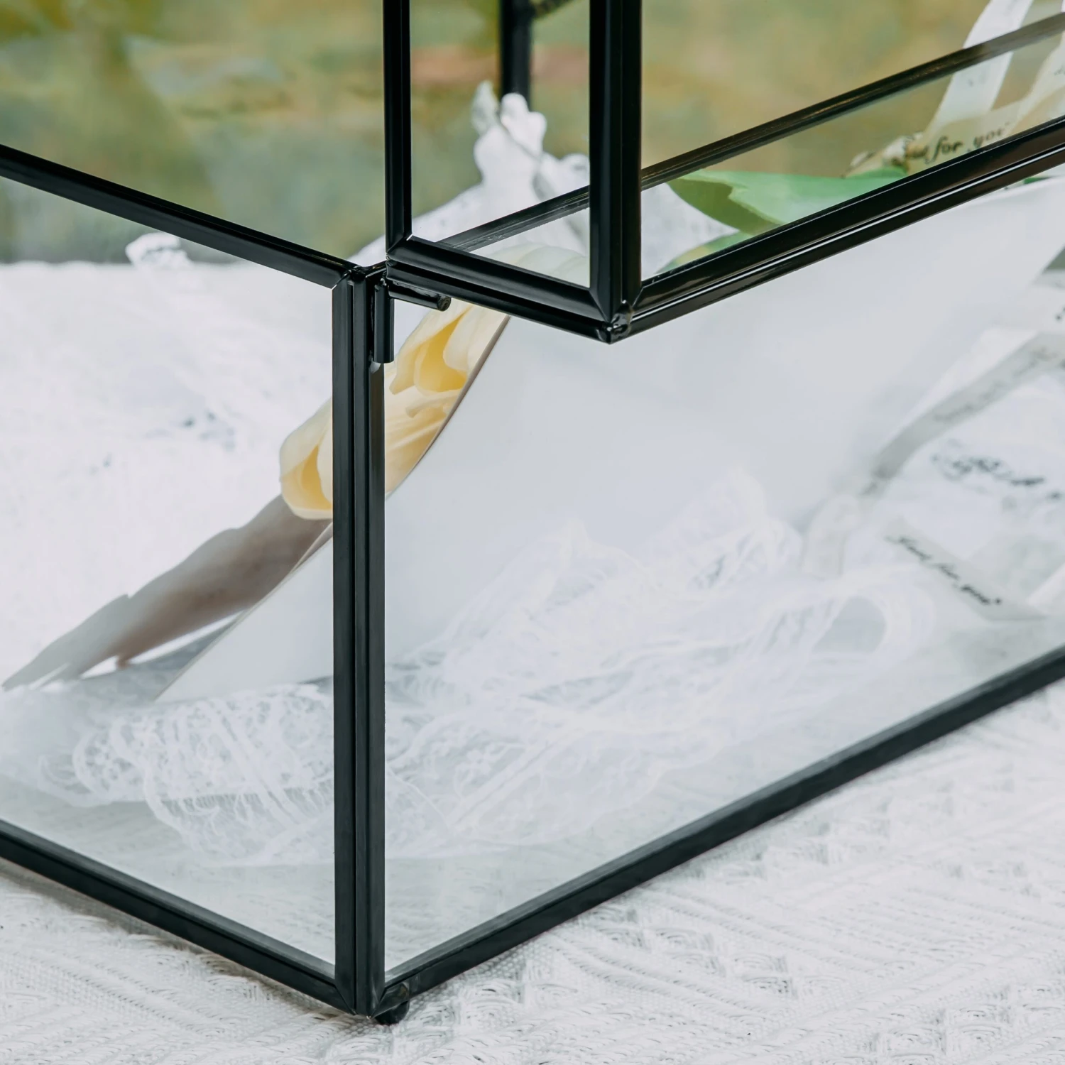 1. This is a large, rectangle-shaped, beautiful geometric terrarium with a top slot. It is excellent for a centerpiece/envelope container on your table/reception