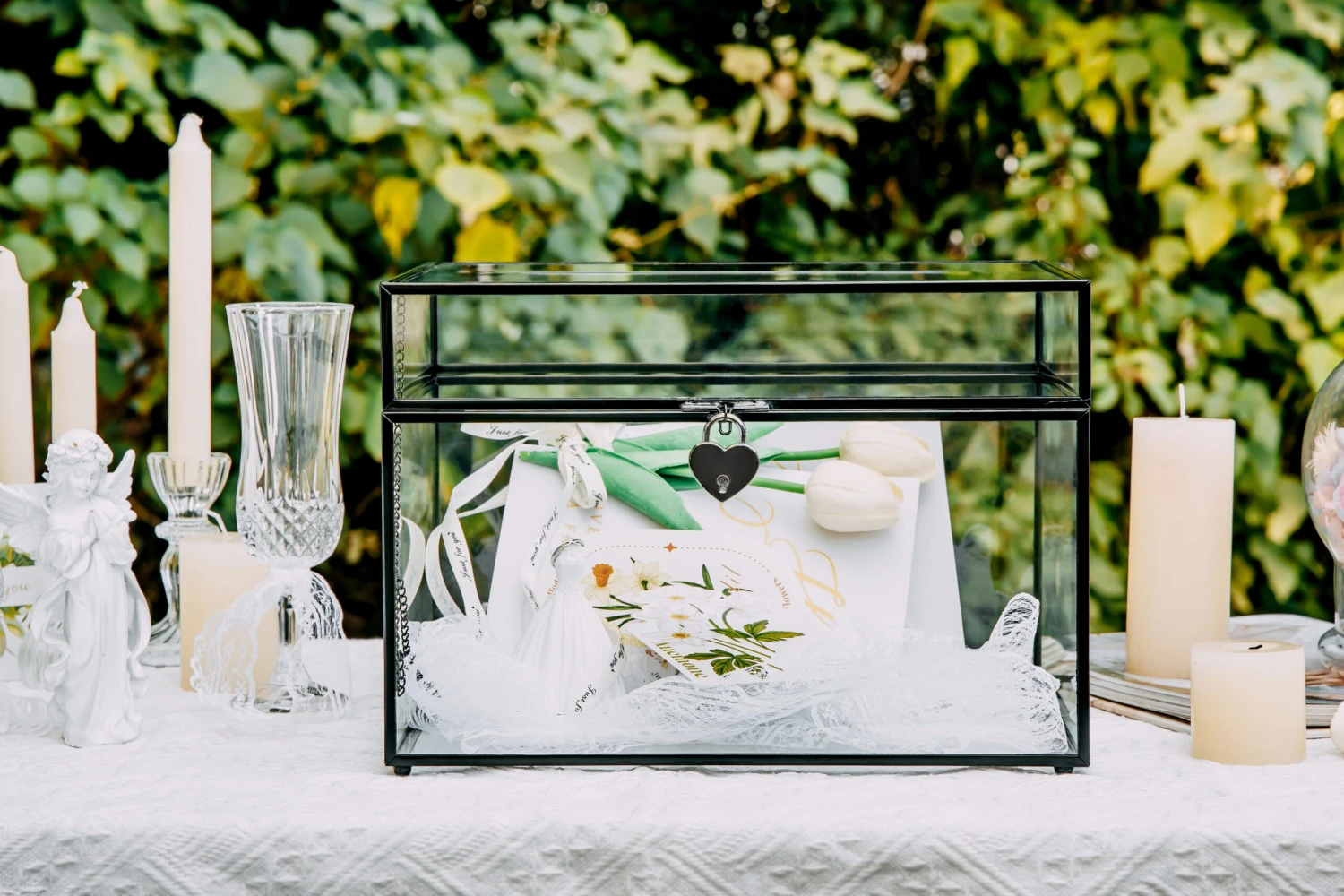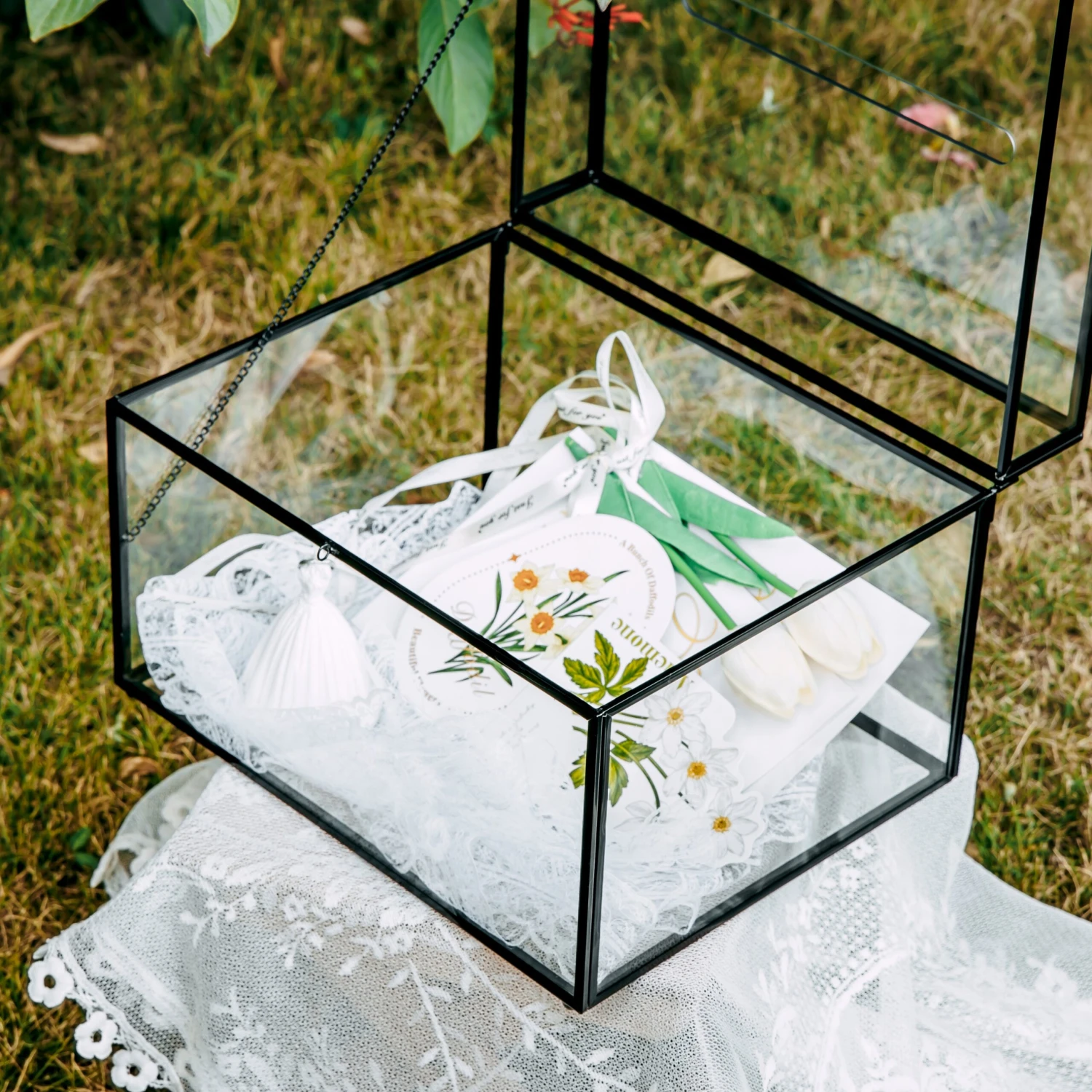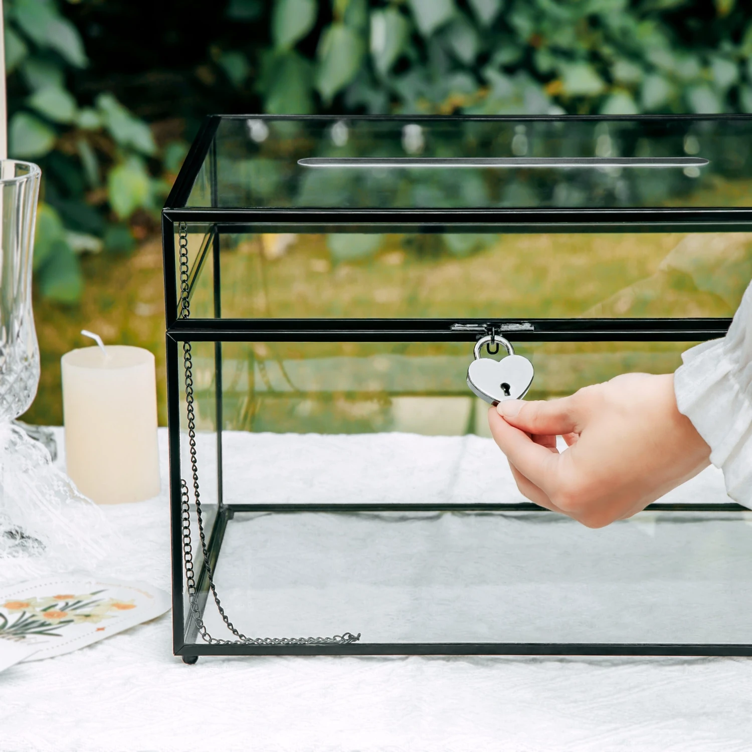 1. This is a large, rectangle-shaped, beautiful geometric terrarium with a top slot. It is excellent for a centerpiece/envelope container on your table/reception