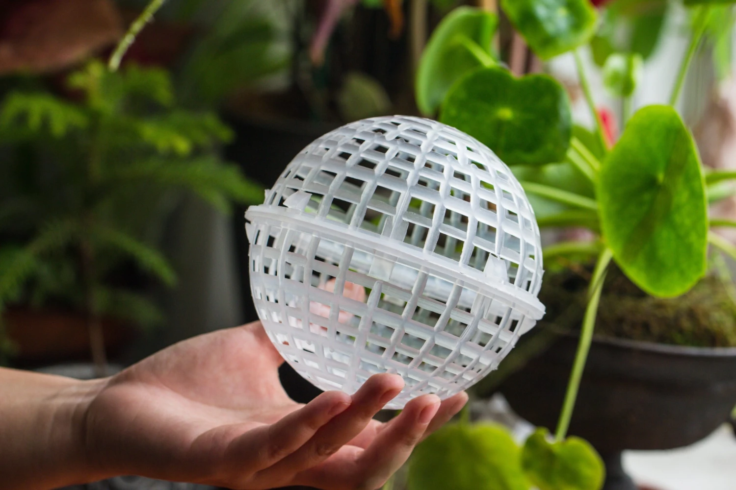That plastic ball was originally designed for wastewater processing. They are durable and environment-friendly. Then, I found them suitable for various hanging wall-mounted planting ideas like orchids, ferns, mirror grass, and other small plants.Â