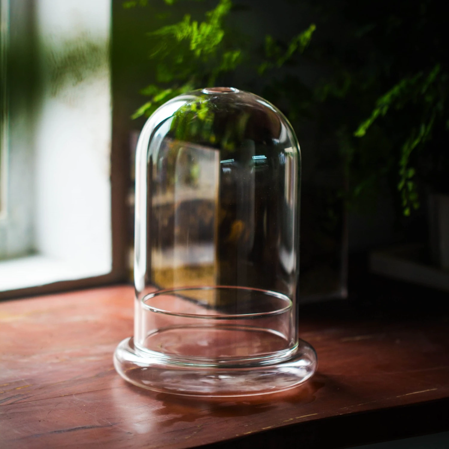 2. The glass cloche is a 2 part design, perfect for your landscapes to keep humidity. It’s ideally suited for moss, ferns, small tropical plants, bonsai, miniatures, and fairy gardens. It has an air hole/ vent at the middle top of the glass cloche to let the humidity out. If you need to feed insects to your tropical plants, you can use a separate metal vent to prevent the insects from escaping.