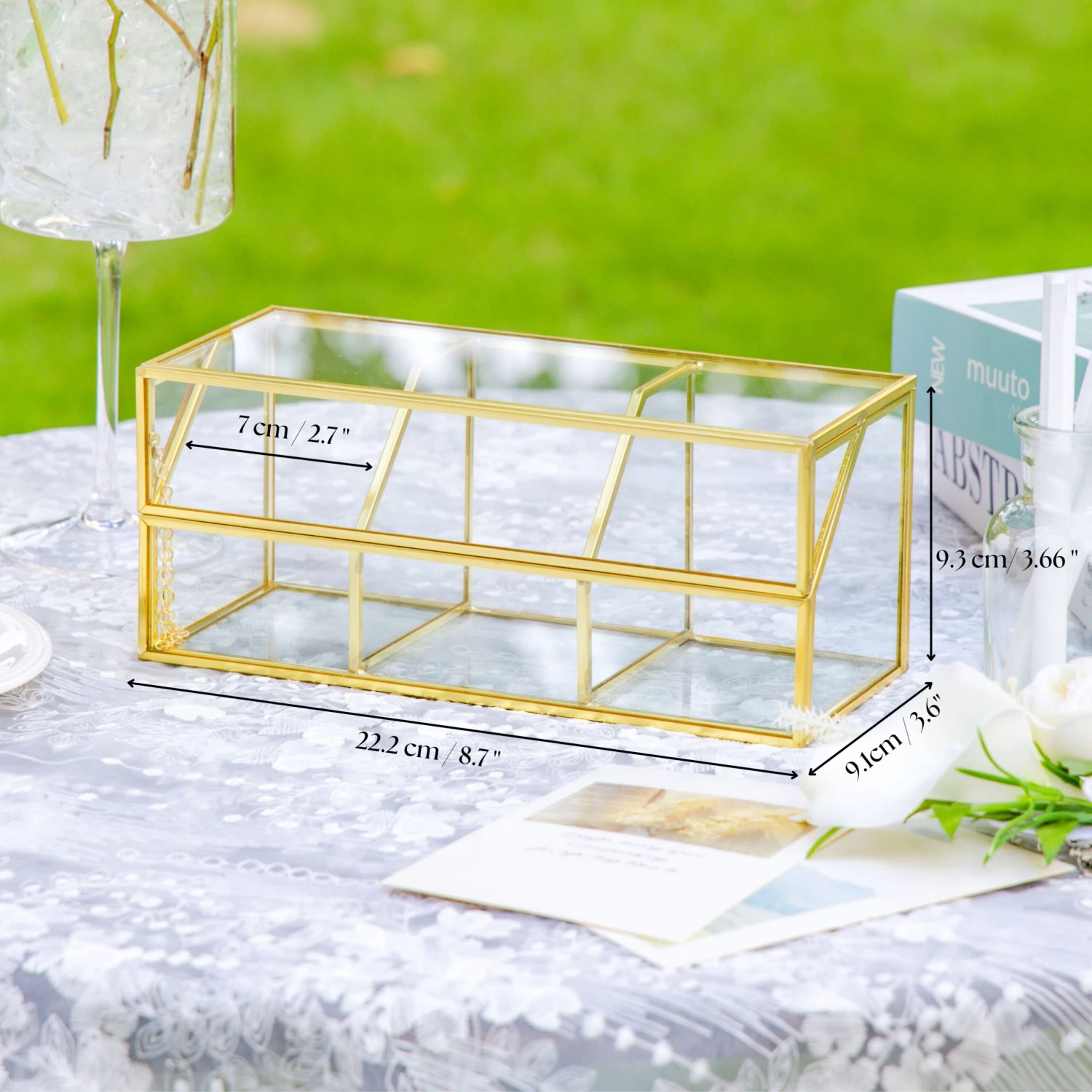 1. Unique tea bag organizer made of reinforced glass and brass. The frame is in a stunning gold color and is suitable for most indoor home and office styles. There is a chain between the lid and the bottom part to keep it safe when opening. The geometric shape of the internal partition boards is designed to maximize space utilization and enhance functionality during the lid opening and closing.