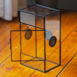 - This is a variant of our popular spider terrarium. This one is made of glass and anti-rust metal, removable black plastic vent. You can taken them out easily. The frames are stainless steel. The biggest difference from our tin version is: it will leak (or drainage), and there are smaller gaps around the door for it needs less soldering.