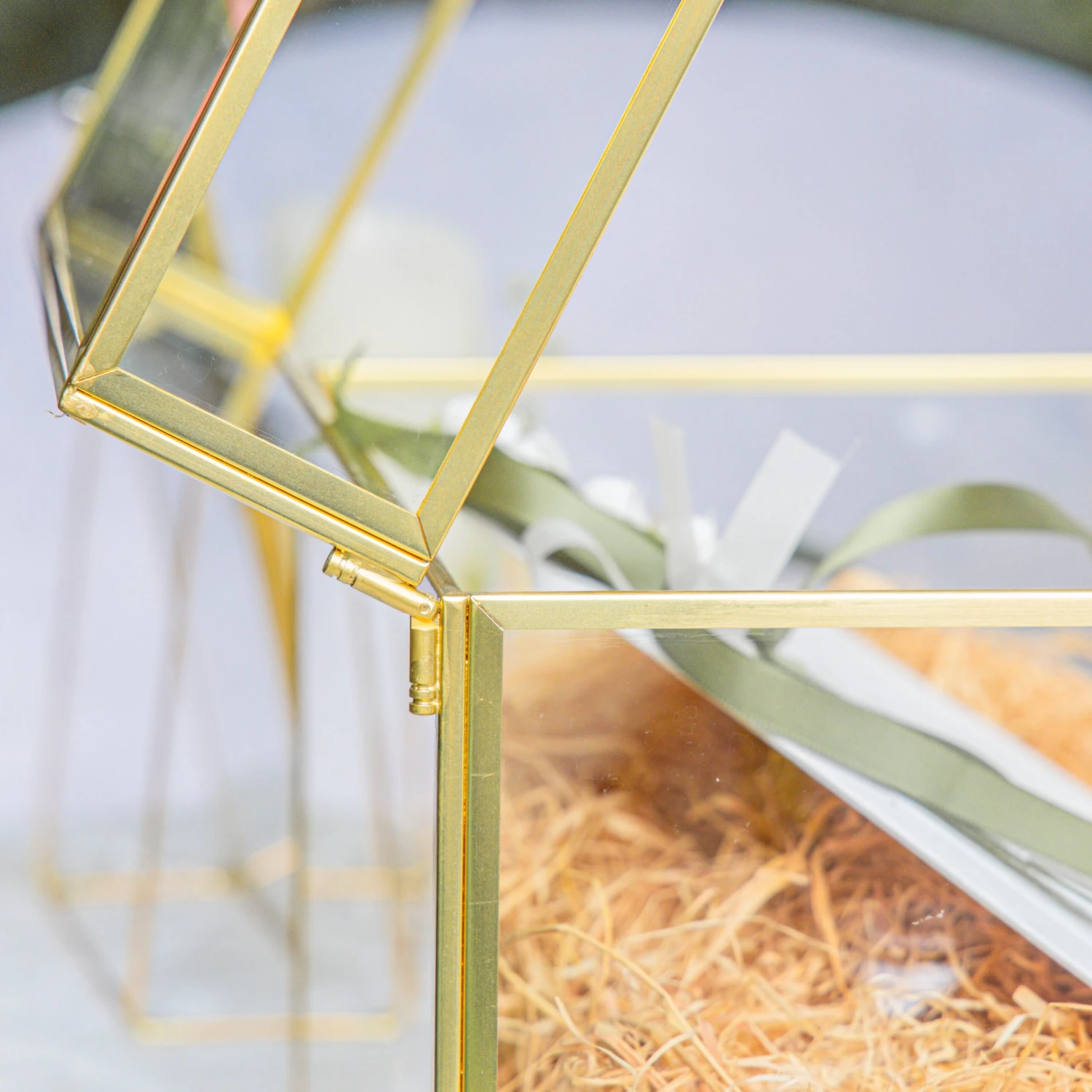 1. Large rectangular brass and glass handmade terrarium featuring a top slot and lockable latch. Ideal for a striking table centerpiece or a sophisticated envelope holder at your reception. Its elegant design and substantial size make it a captivating focal point for any gathering.