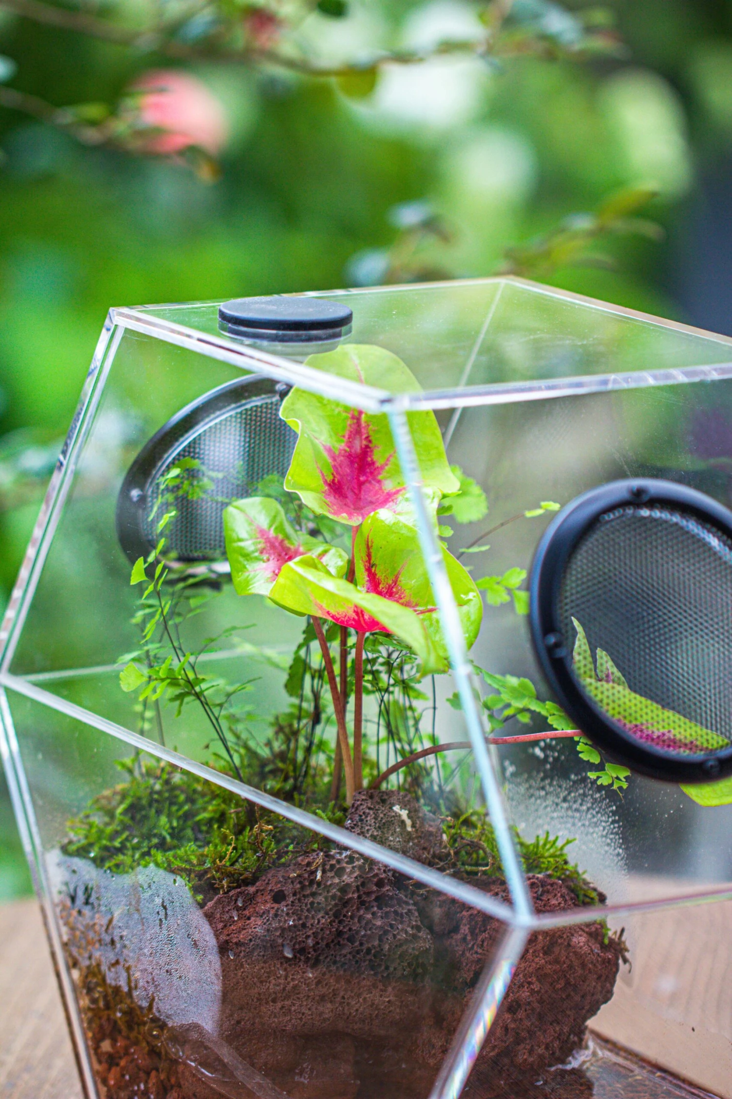 - This is a large terrarium, and you can put in your small tropical plants. In the photos, there are a caladium, two maiden hair fern. If you need some moss, please leave me a message and I am glad to send you some pieces.same as the photos show (Those mosss suits in such environment). Â