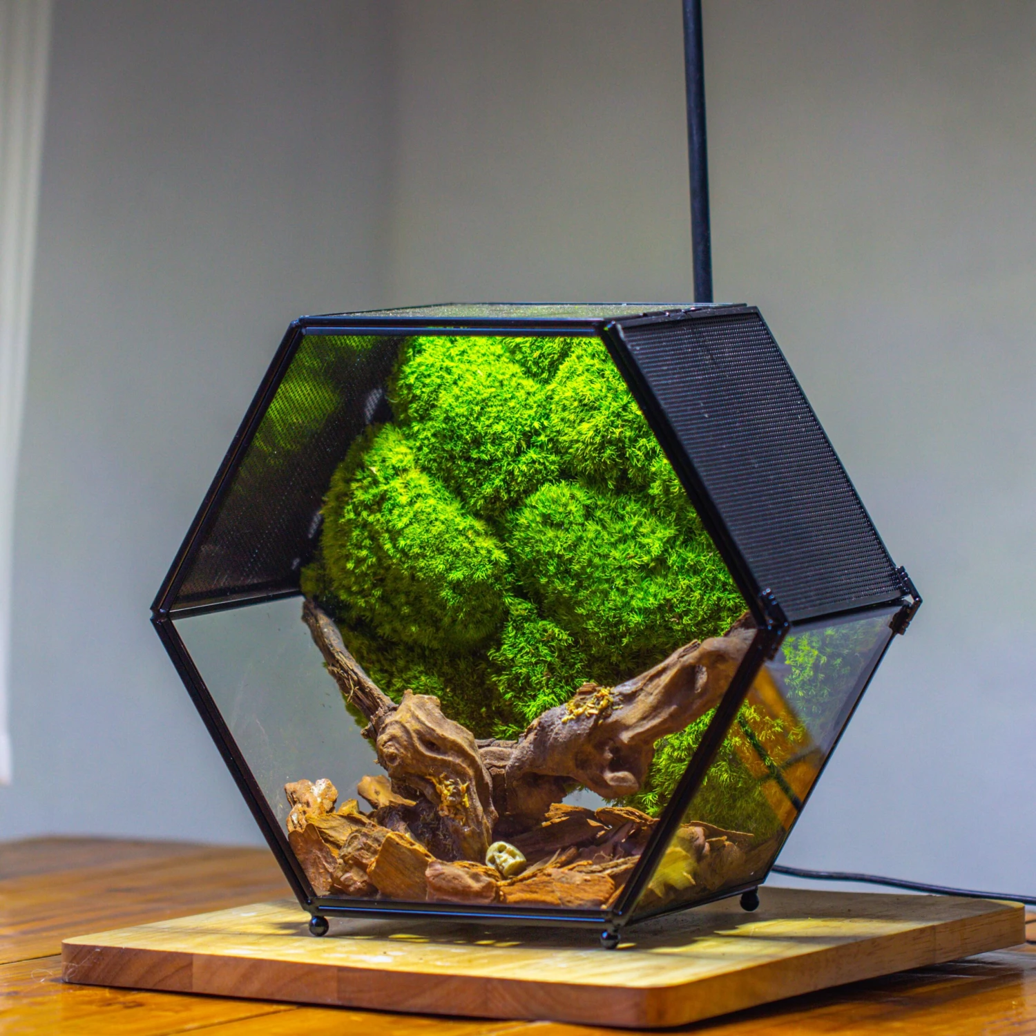 - This hexagon shape, black terrarium for small insects. It is made of is stainless steel and reinforced glass. It is durable to use. It does not rust. There are two facing mesh panels to ensure good vent. The door has a slide latch to open / close.