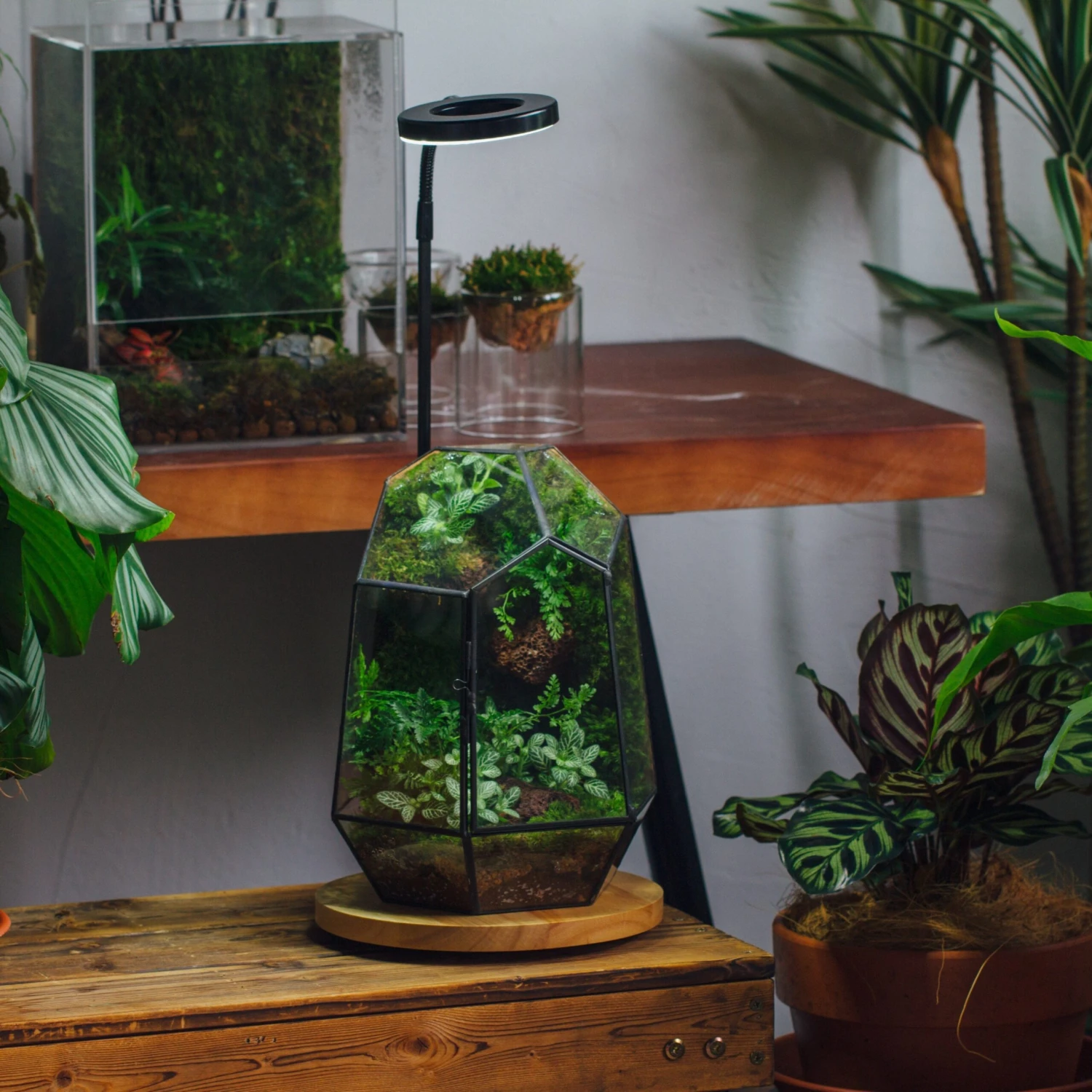 This is the LED grow light and wood base set. Please note: succulents and terrarium are not included.