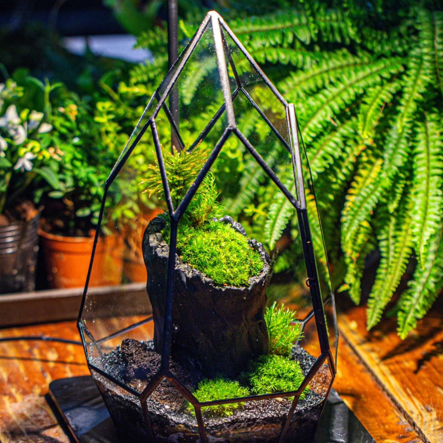 The tall plant is a tall moss, about 10cm (2.54 inches) tall, not included. Please replace it with any of your favorite small plants. Fern, shade plants, and small tropical pants are recommended.