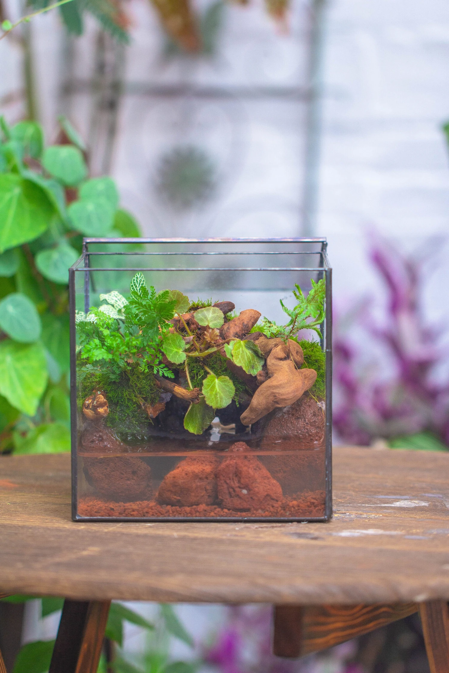 1. This is a rectangle, watertight, small closed terrarium,7″ / 17.8cm side length, with the lid on the top, with multiple sizes available. They are made of tin and glass and are suitable for moss, small tropical plants, like begonia, string of turtle, and saxifrage. Best plant decor on your shelf, living room, or table with an LED grow light, as shown in the photos.