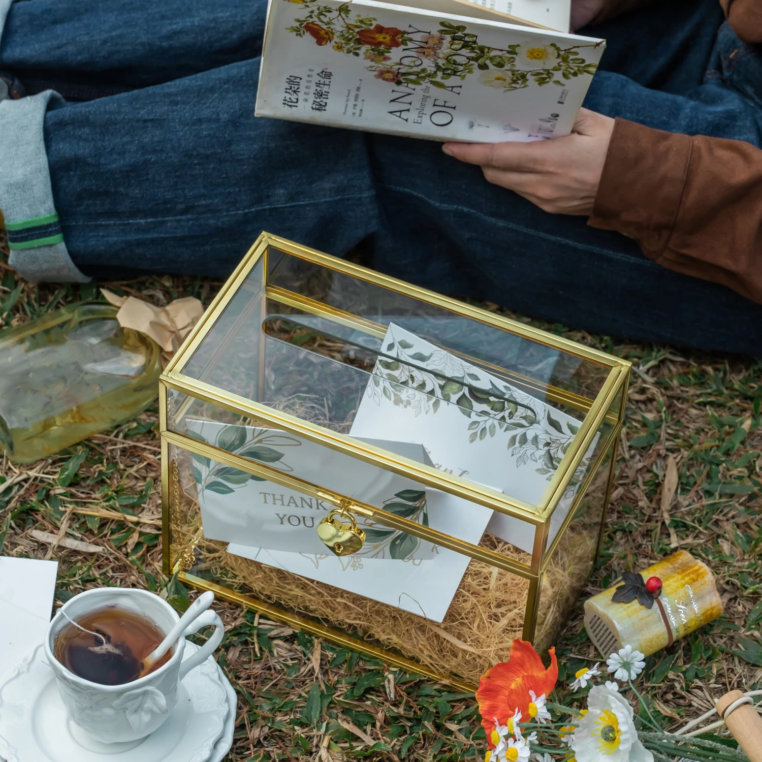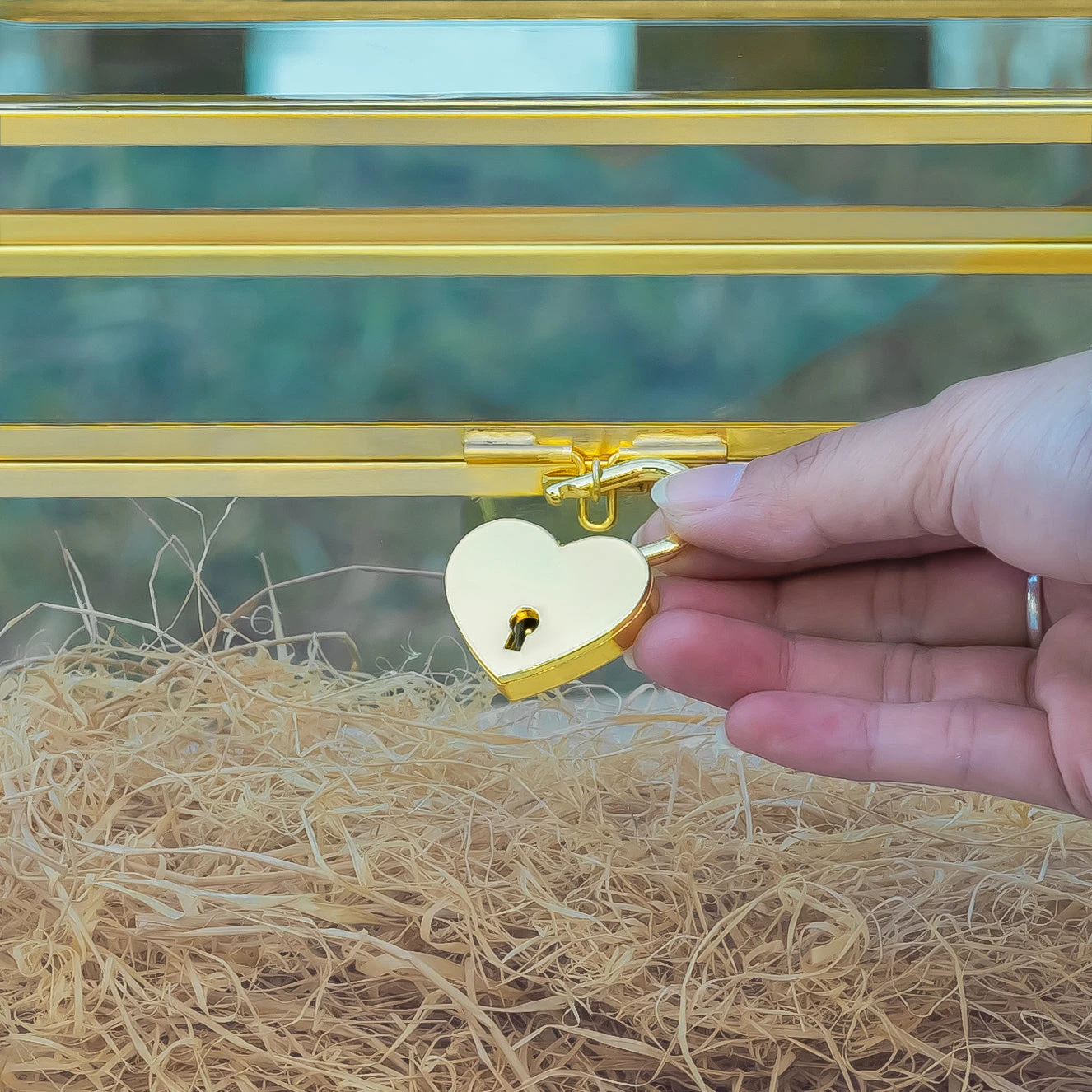 - 2. The gold rectangle-shaped glass card box, with a swing lid, top slot, lockable lid, and a heart-shaped lock with key, is great for a centerpiece or display case. The lockable design ensures that the contents inside are safe and secure, perfect for card collection or wish well on the reception table.