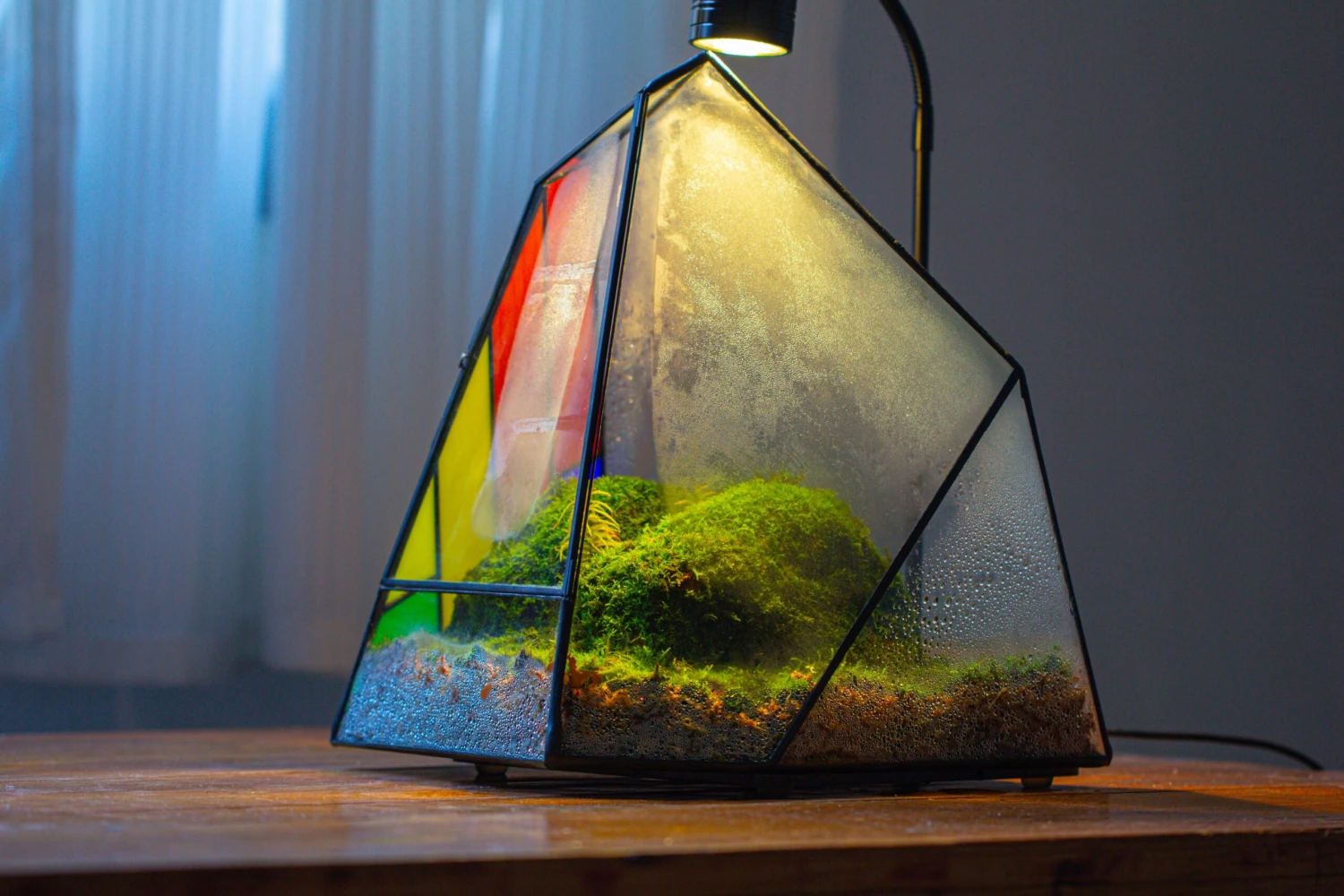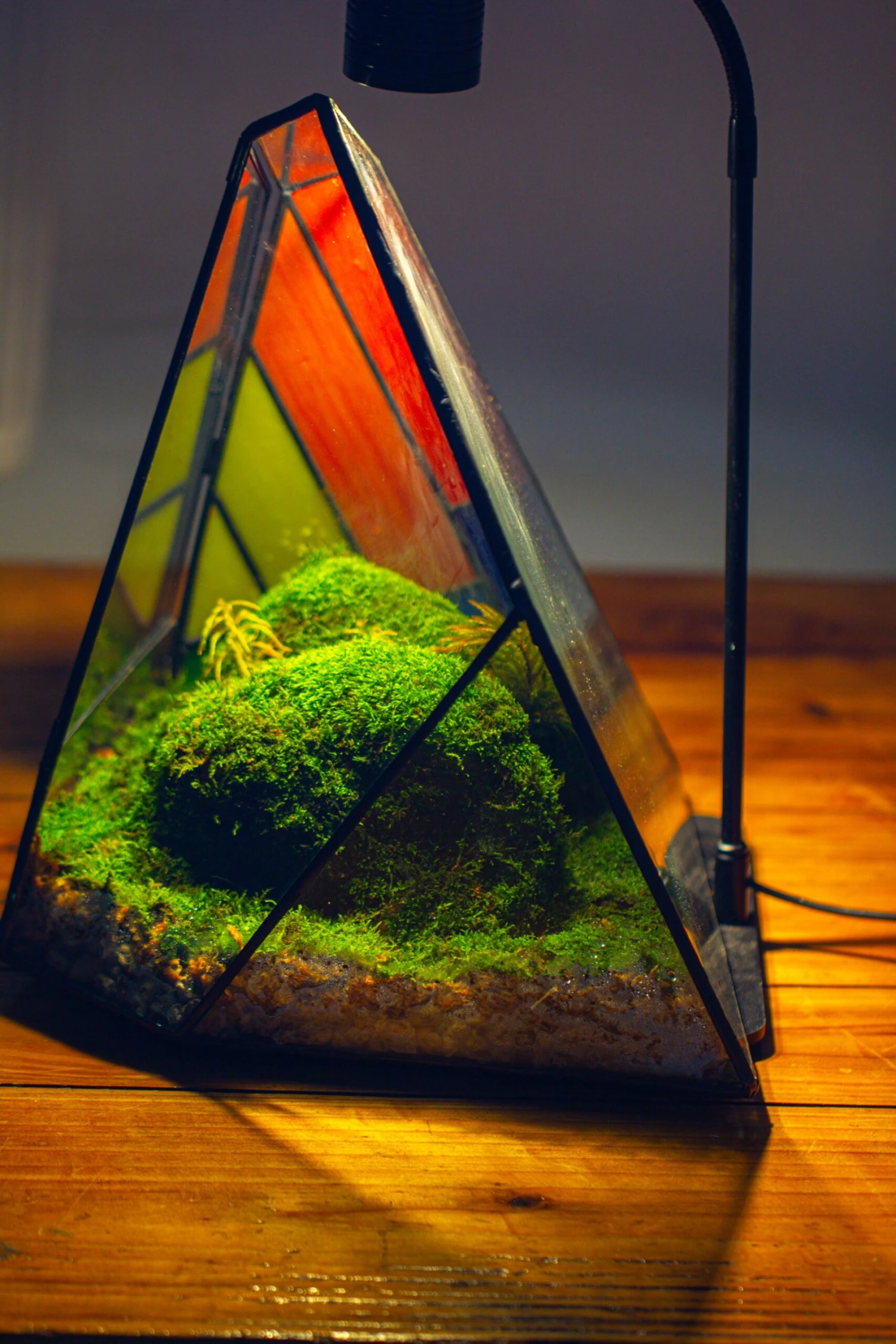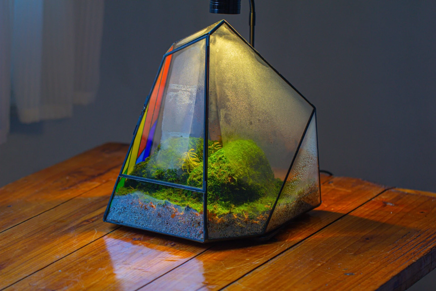 1. This is a totally handmade geometric, mountain peak terrarium. One of the panels is made of rainbow-colored stained-glass panels. It is inspired by plants frozen in ice peak.