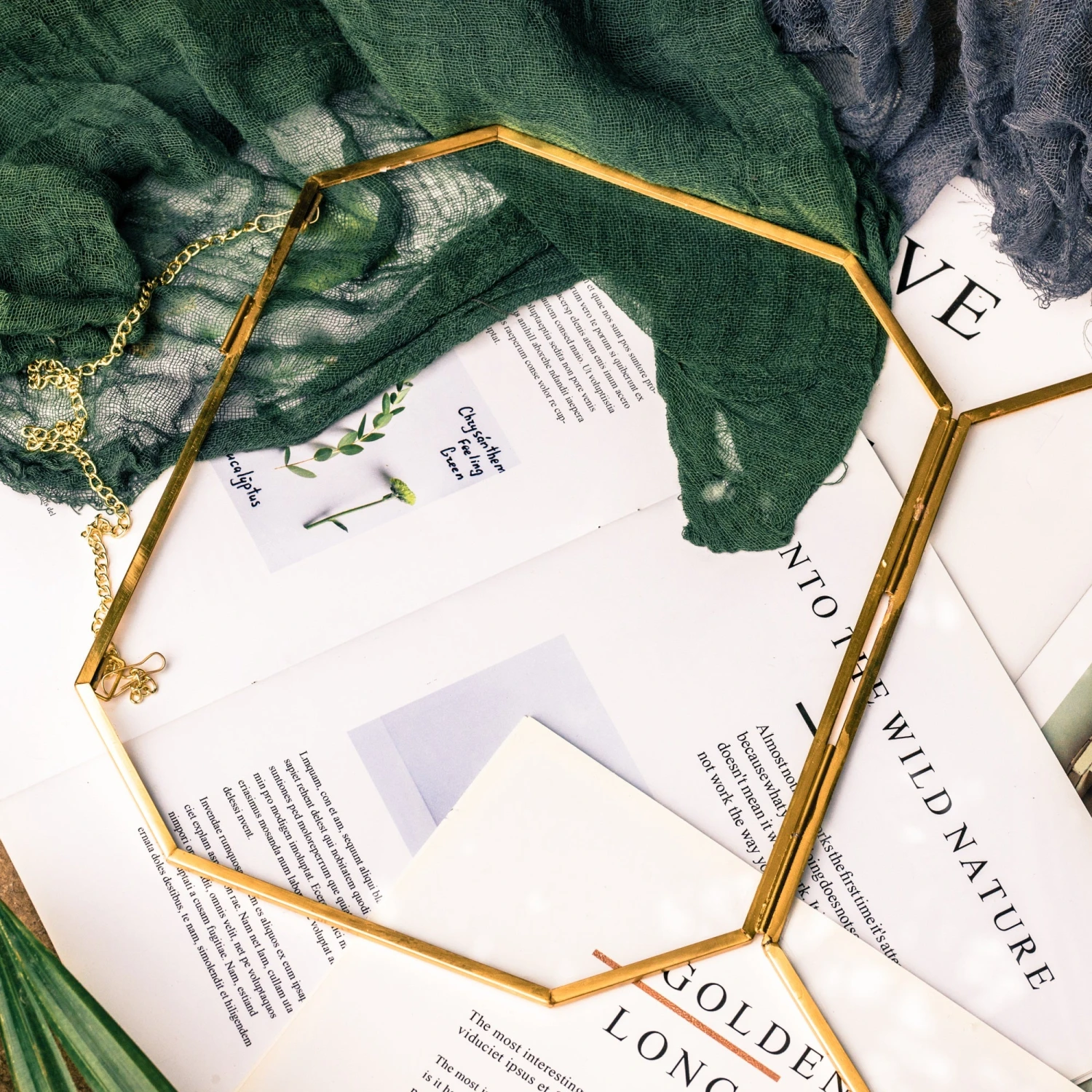1. Handmade long octagon double glass brass and glass frame with a natural vintage gold color, go well with pressed flowers and plants