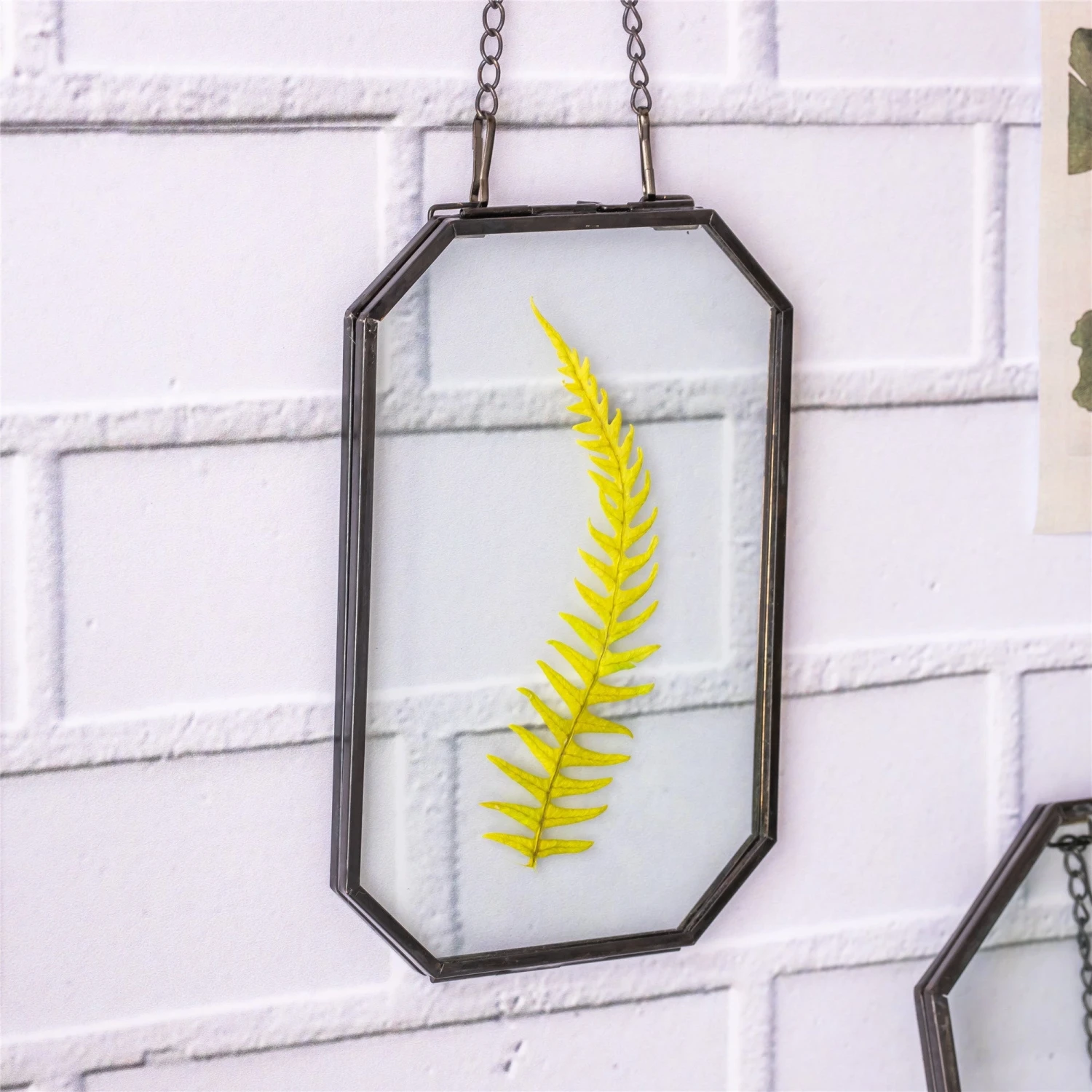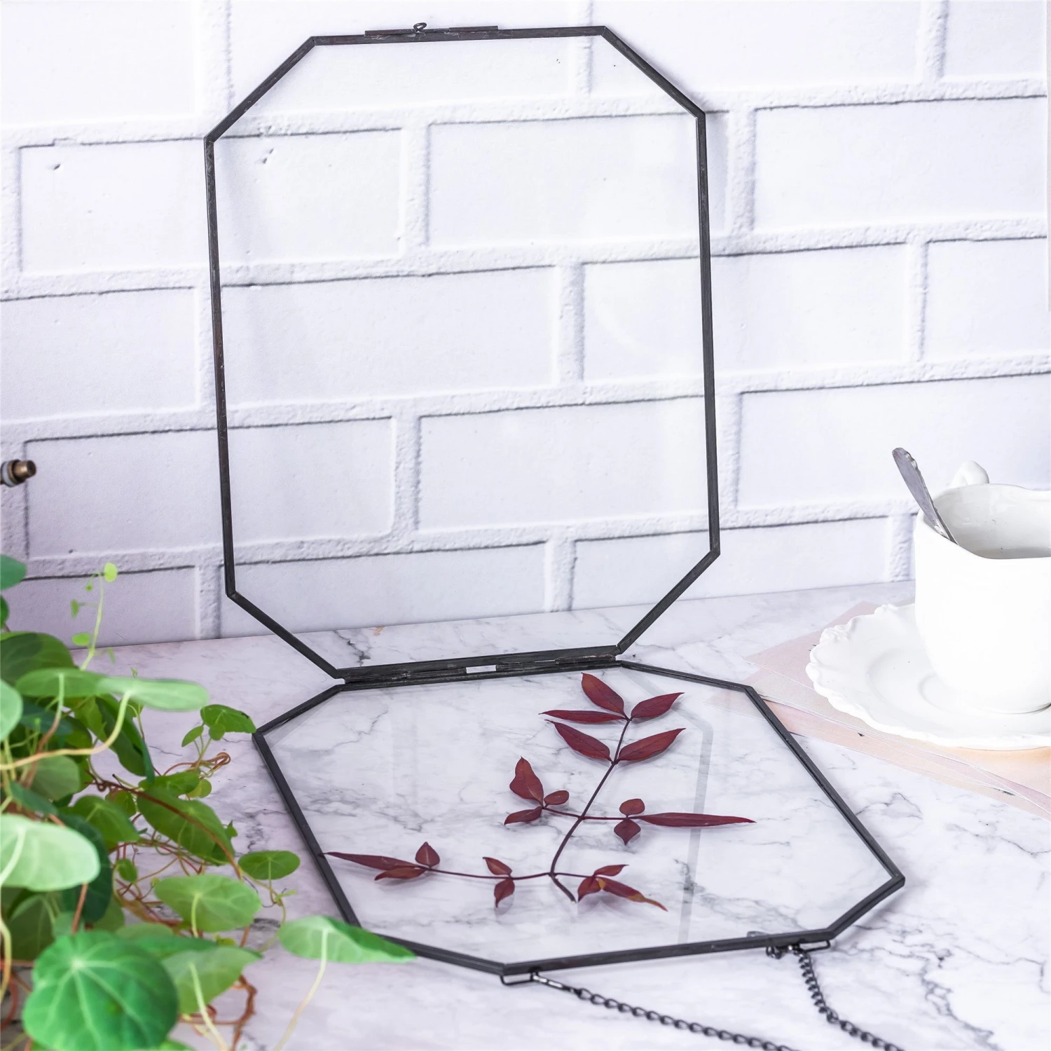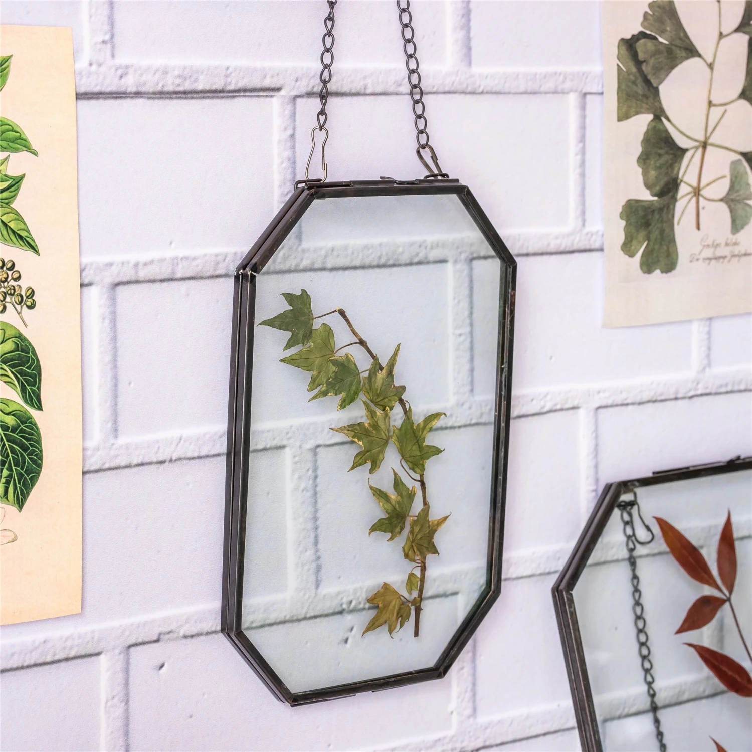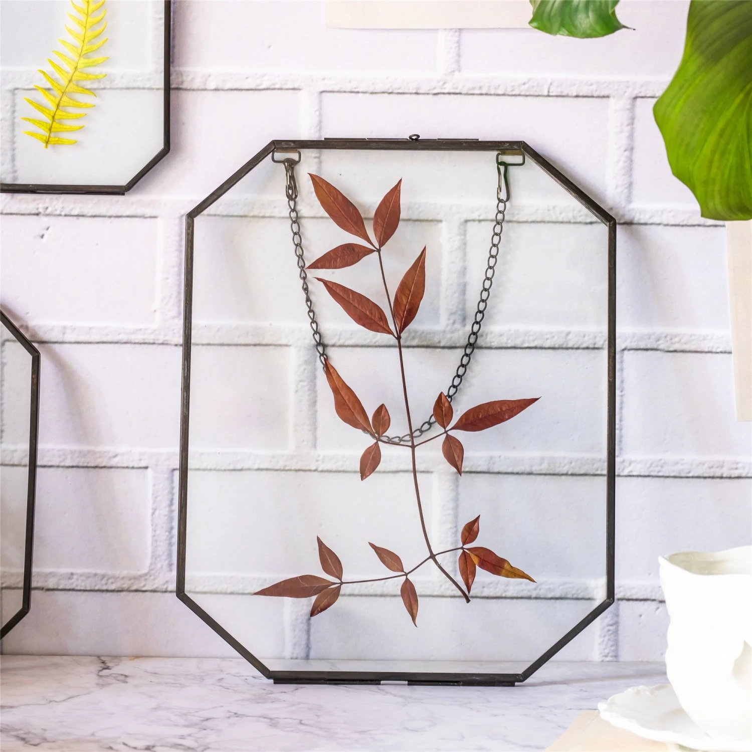 1. Handmade long octagon double glass painted brass and glass frame with a natural vintage black color, go well with pressed flowers and plants.