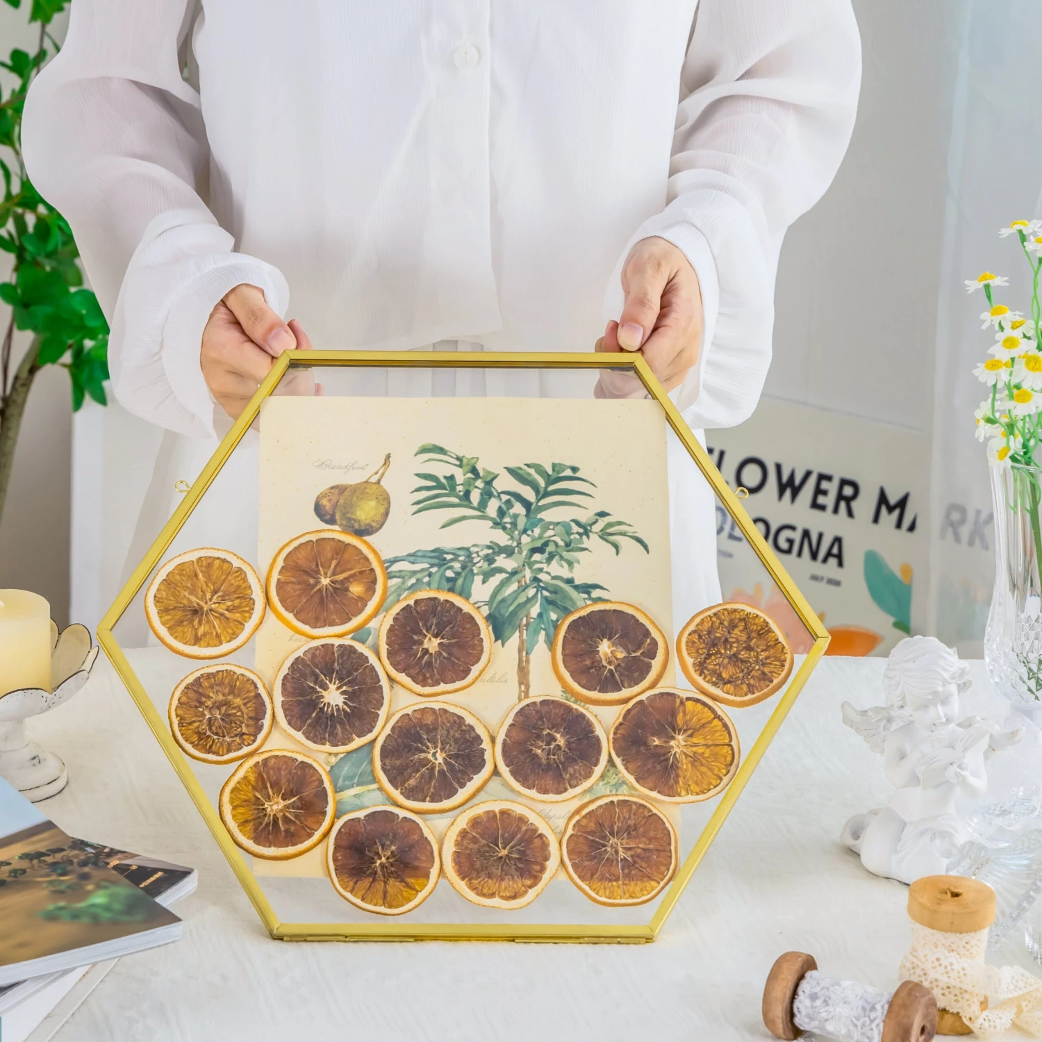 3. Handmade hexagon double glass brass and glass frame with a natural vintage gold color, go well with pressed flowers and plants.